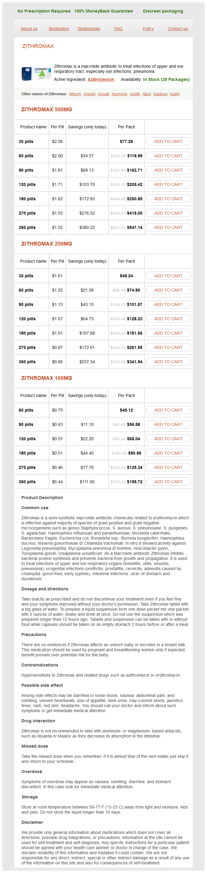 Zithromax packs: 30 pills, 60 pills, 90 pills, 120 pills, 180 pills, 270 pills, 360 pills